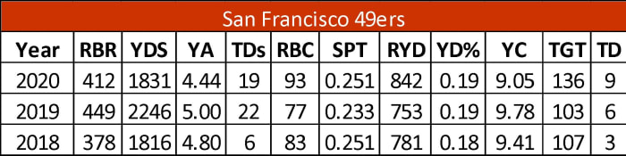 Over the past two years, the 49ers’ running backs scored 57 touchdowns. In 2020, they gained 2,673 combined yards with 28 scores and 93 catches or 33.02 fantasy points in PPR leagues.